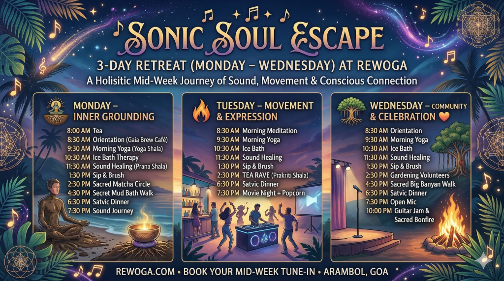 At Rewoga, we believe wellness is not only about quiet meditation — it is also about celebration, creativity, and connection. Our retreats combine traditional practices like yoga and meditation with expressive experiences such as ecstatic dance, sound healing, nature exploration, and community gatherings. Located in the vibrant coastal village of Arambol, Rewoga offers a unique environment where travelers, seekers, and creators from around the world come together. What makes the Rewoga experience special: • A blend of healing, creativity, and joyful expression • A welcoming international community • Beautiful Bali-style retreat spaces surrounded by nature • Unique experiences like ecstatic dance and sound healing • A peaceful yet vibrant atmosphere that encourages connection Rewoga is not just a retreat center — it is a community of people exploring conscious living together.