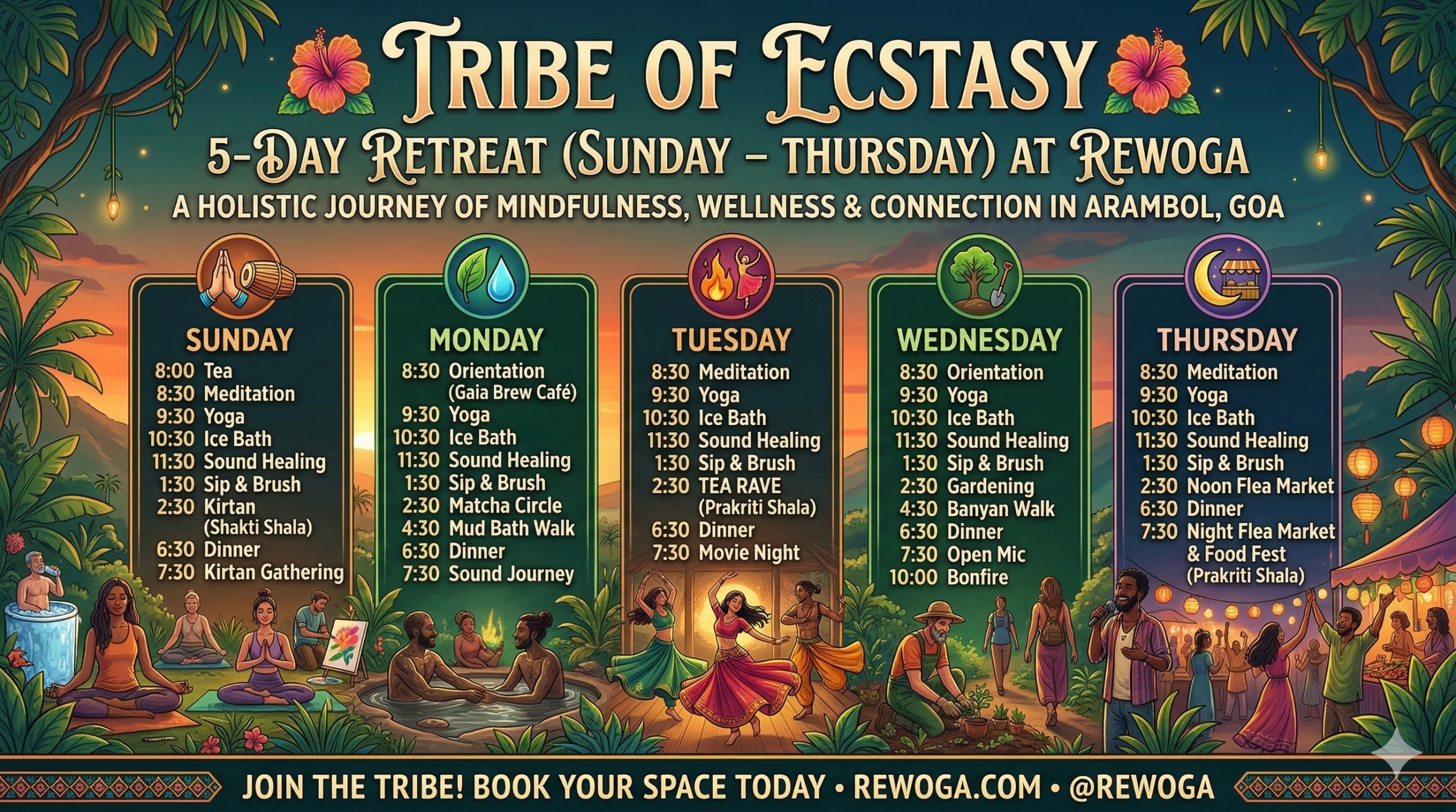 Each retreat has a structured yet relaxed schedule that may include: Morning yoga and meditation Workshops and nature experiences during the day Evening gatherings such as ecstatic dance or sound healing There is always free time to rest, explore Arambol, or enjoy the beach.