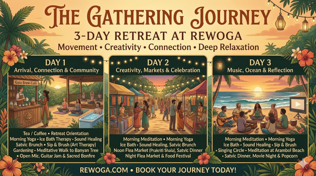 At Rewoga, we believe wellness is not only about quiet meditation — it is also about celebration, creativity, and connection. Our retreats combine traditional practices like yoga and meditation with expressive experiences such as ecstatic dance, sound healing, nature exploration, and community gatherings. Located in the vibrant coastal village of Arambol, Rewoga offers a unique environment where travelers, seekers, and creators from around the world come together. What makes the Rewoga experience special: • A blend of healing, creativity, and joyful expression • A welcoming international community • Beautiful Bali-style retreat spaces surrounded by nature • Unique experiences like ecstatic dance and sound healing • A peaceful yet vibrant atmosphere that encourages connection Rewoga is not just a retreat center — it is a community of people exploring conscious living together.